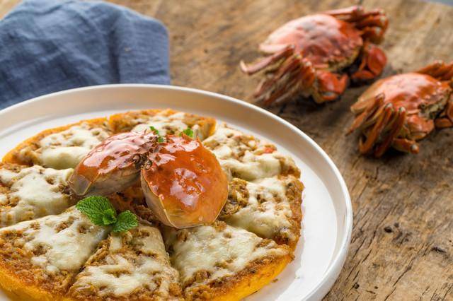 醉蟹酒酿饼是香格里拉酒店集团区域中餐行政总厨、南京香格里拉大酒店淮扬刀客侯新庆师傅的首创之作。侯师傅萃取了江南灶招牌熟醉蟹的蟹粉蟹膏,和传统酒酿饼一起做成了匹萨的形状, 结合马苏里拉芝士进行烘烤。如醉三分醒的酒酿饼,用当地冬小麦和酒酿揉面,烘烤后饼底是规整的金黄,面皮酥香,馅心细腻晶莹,芝断丝连味绵长。这道菜刚好承接了酒酿的清甜与绵密,与醉蟹的甜相得益彰,可谓中西合璧,蟹不醉人人自醉。