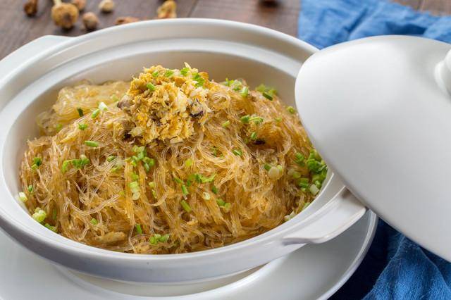 成都香格里拉大酒店的中餐厅行政总厨唐建树师 傅选用金华火腿、瑶柱、海米等原材料手工制成 生焗酱,混合花生油,和绿豆粉丝入高汤大火煮, 然后加入精选的母大闸蟹蟹肉,收汁时放入少许 香菜、葱花等制成这道黄金桂花蟹。蟹黄晶黄油 润,味道鲜美醇厚,经过精细煲制的粉丝劲道多汁,海鲜风味浓郁。最后出品配以西生菜,爽口又解腻。