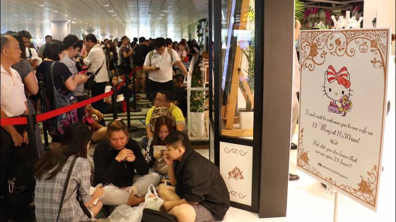 吉蒂猫胡姬花园咖啡馆在2016年开幕前,门外大排行长龙。(照片:Alicia Tantriady)