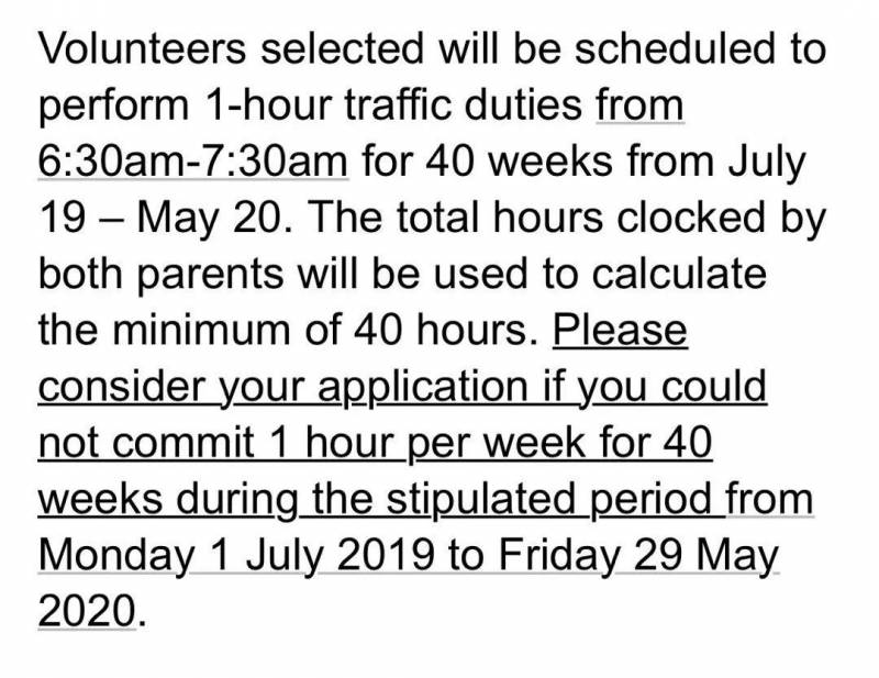 成功申请为义工的家长们,每周将在早上6点半至7点半之间指挥1小时交通,从2019年7月至2020年5月累计40周,至少40小时。如不能在指定时间完成,请慎重考虑申请。