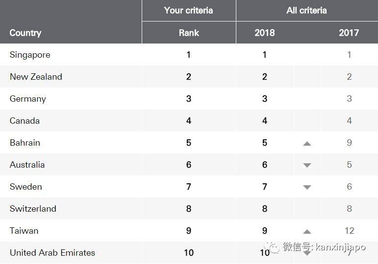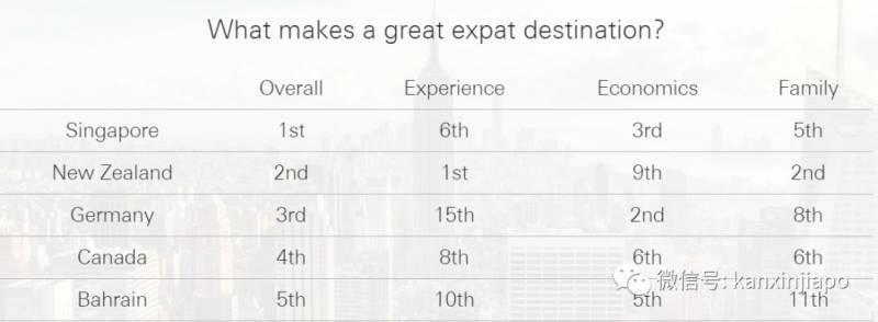 紧随其后是新西兰、德国、加拿大和巴林王国。其中瑞士、新西兰和瑞典分别在经济、体验和家庭三大方面排名第一。