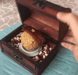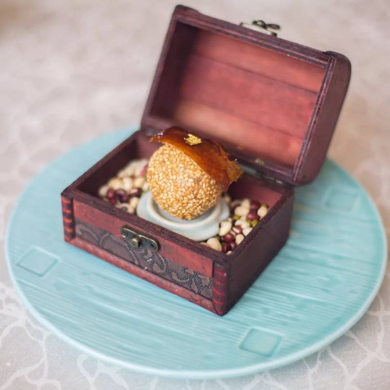 点心同样放在珠宝盒中,只不过底下用了五谷作为点缀,让人见人爱的叉烧煎堆立在中间,仿佛一颗明珠。