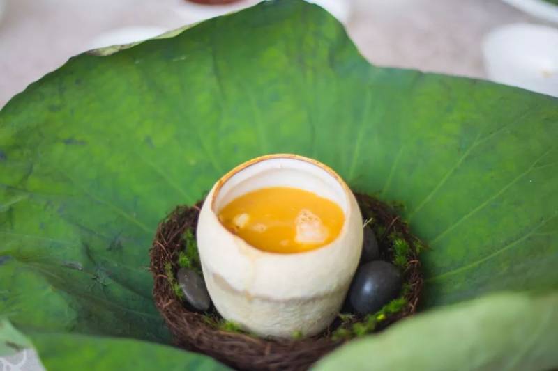 另一个让人眼前一亮的菜品就是这道椰盅乌打东炎海鲜浓汤(S$26/份)。首先上来的时候,用椰子壳盛的汤品竟然是放在很大(真的很大)一片荷叶之中。