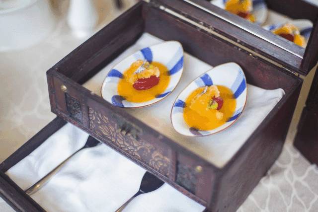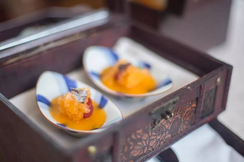 首先上场的是前菜番茄话梅冻。腌制过的番茄放在酸梅沙冰上,精致的小碟子竟然盛放在古旧的首饰盒中!汤匙则是藏在另一个小抽屉里,充满了师傅的巧思。