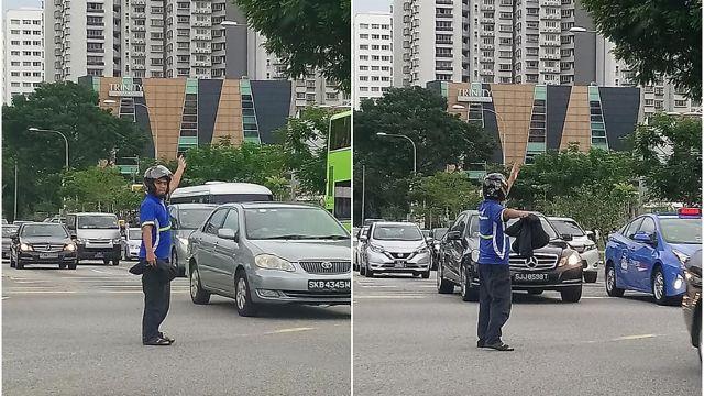 当她正在观察路况时,发现有一名穿着蓝色T恤的男子自动自发地在路上为司机和行人指引交通。