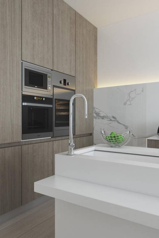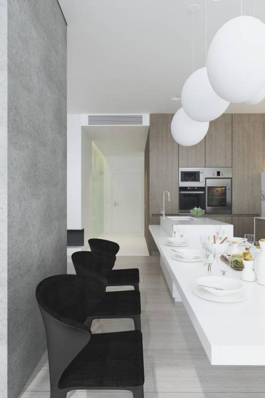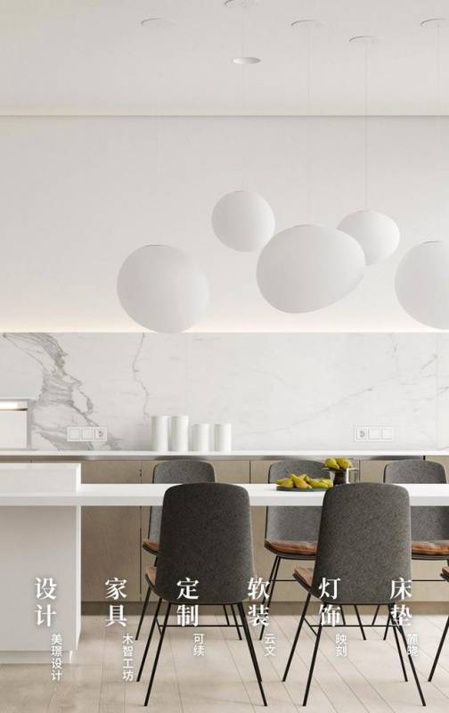 餐厨区域是一体化的设计,打破空间的限定。充满艺术感的吊灯,错落悬挂在白色大理石餐桌上方,带来视觉上的享受。