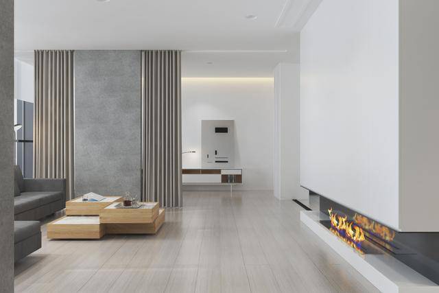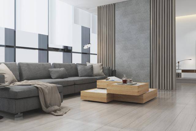 客厅是极简风,原木茶几呈现悬浮式的艺术美感,搭配柔软的沙发,营造优雅舒适的居家氛围。