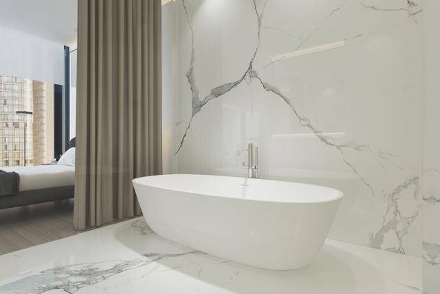 浴室以泼墨瓷砖铺成空间,去除一切不必要的装饰物,只留下一个手工打磨的瓷白浴缸,也能提升空间的质感。