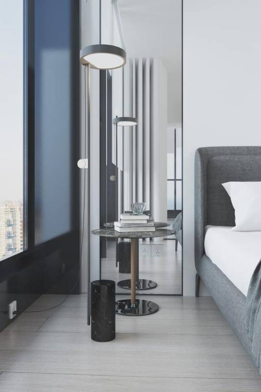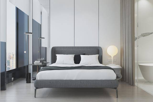 卧室的设计十分简约,没有多余的装饰。左边落地灯、右边床头摆灯,满足空间不同氛围的照明需求。围合式的软包大床私密舒适,给予身心更多安谧享受。