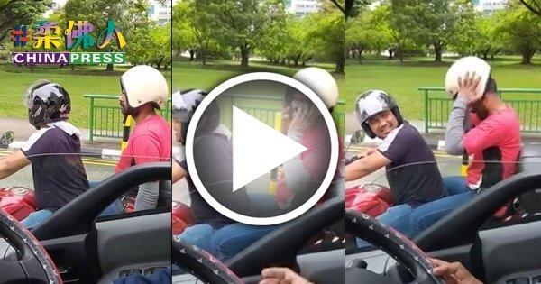 (新加坡13日综合电)近日在网络流传一则视频,一名司机在等待红绿灯时,忽然看到身边一辆载着两个人的摩哆。