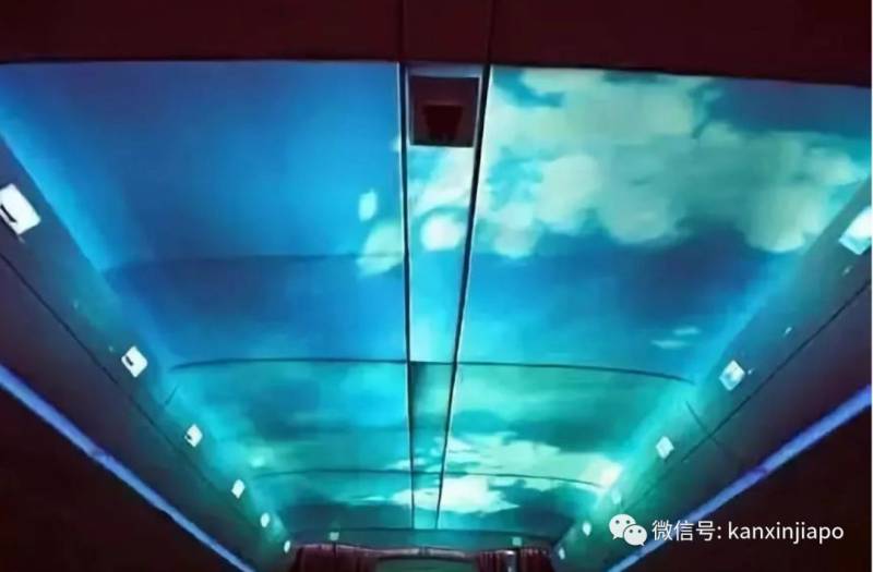 黑科技的新航,为了让乘客不要感到机舱内时间混乱昏天黑地,还取消了机舱顶棚行李架,别出心裁地设计了客舱顶棚的光线效果,“制造”出蓝天白云。