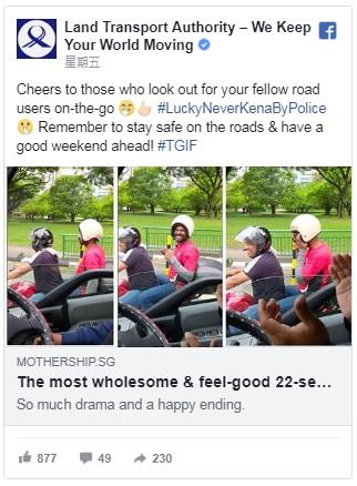 陆路交通管理局(LTA)傍晚也在Facebook页面上表扬那些时刻注意到其他公路使用者安全的公众。当局也借此机会提醒大家在公路上多注意安全。