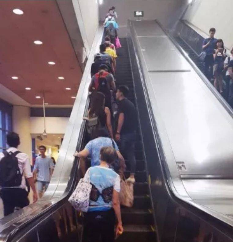 尤其是当你赶时间,必须要从右侧上去的时候,看着背后也没长眼睛的他,你就站在他身后纠结——到底是拍他肩膀呢,还是说“Excuse me”呢,还是啥也不说,硬是从缝隙中挤过去呢?