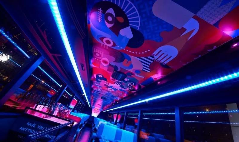 车内不是单调的独立座位,而是一排排软硬适中的沙发,小文不禁怀疑,这是巴士还是夜店?夸张现代的涂鸦,彰显著年轻活跃的气氛。