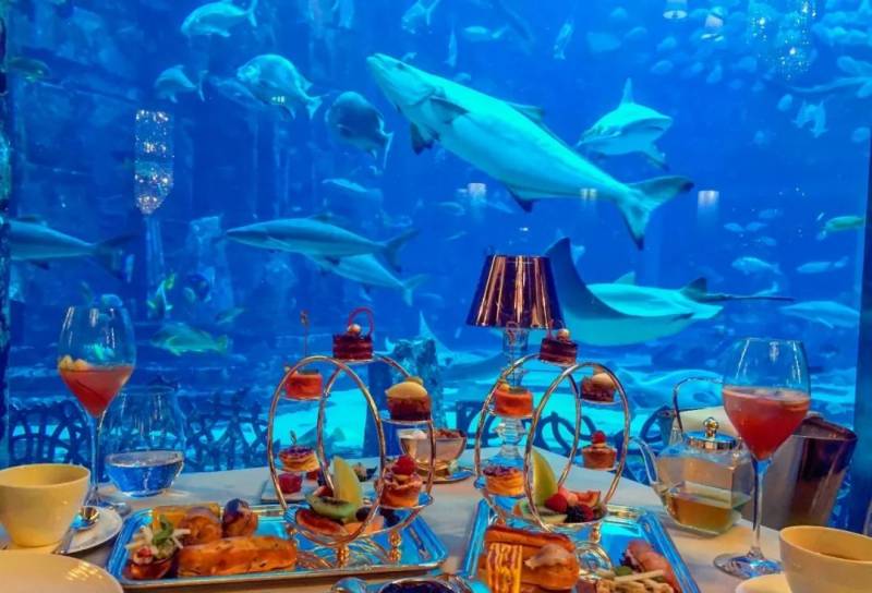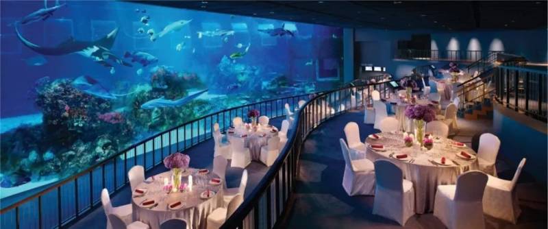 这家餐厅位于SEA水族馆内,环境好的没话说,洁白色的桌椅和蔚蓝的海底相映成趣。