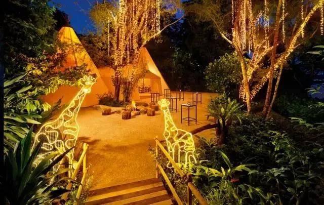 新加坡夜间动物园在路上、树间置以灯光,用纸雕等艺术形式让灯光具有美感。