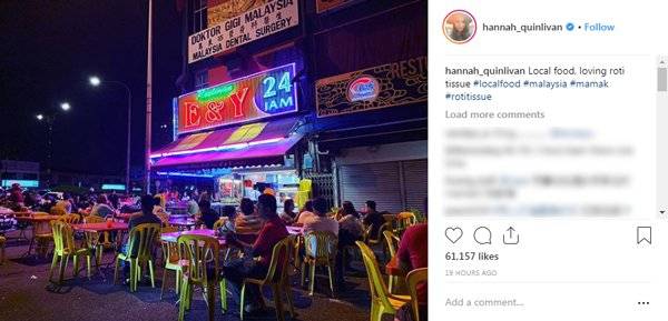 她也以主题标签(hashtag,“#”)写着“mamak”(嘛嘛店),颇融入本地饮食文化。