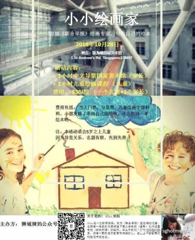 这个周六早上,“狮城辣妈”诚邀你的未来小艺术家们,跟随前《联合早报·逗号》漫画专栏画家Alice一起享受一趟充满创意和灵感的”出书之旅”!在这个工作坊中,孩子们不仅会学到漫画创作的基本技巧,还能够在老师的循循善诱下,找到开启“将想像转变为艺术”大门的金钥匙,最后将绘画与每个人独特的想像结合起来,做出一本独一无二的专属漫画书!