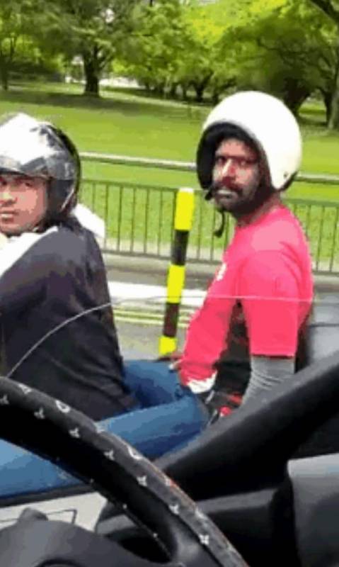 没错,就是后面这位小哥把自己的头盔戴反了!