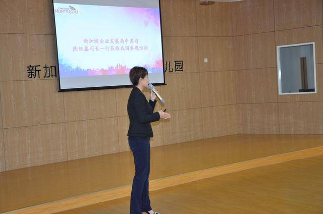2018年10月11日下午,新加坡企业发展局中国西部司副司长陈钰鑫、企业发展局华西司主任袁颖女士、企业发展局华西司孙夏女士一行莅临碧桂园凤凰城新加坡品格蒙特梭利幼儿园参访,新加坡品格蒙特梭利董事长黄国强先生陪同考察,新加坡品格蒙特梭利(中国)运营中心CEO毛羽先生、执行经理王昌文先生、首席教学总监张燕女士、运营总监李彦平先生对陈钰鑫司长一行进行了热情接待。