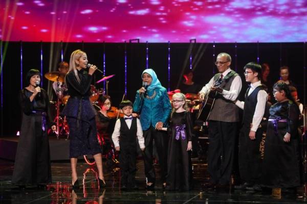 哈莉玛总统(左4)在昨晚举行的总统星光慈善筹款节目中,破天荒与夫婿穆罕默德(右三)上台演唱。