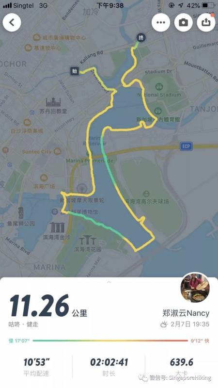 从劳明达地铁站出发,经金沙,滨海湾,经体育场外侧沿着加冷河到达加冷地铁站。