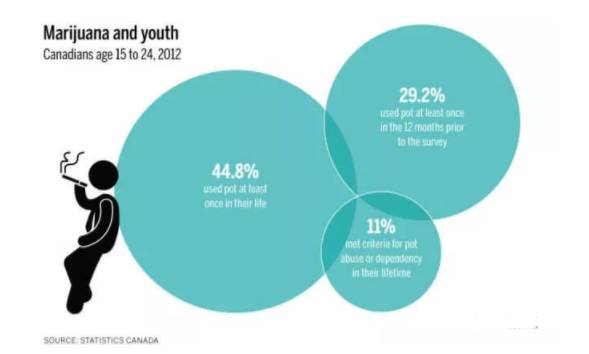 但另一方面,据2015年的一次数据调查,人口仅3671万的加拿大,约有490万人使用过大麻产品,约占到人口的13%。而6年前的另外一次调查显示,15至24岁的加拿大年轻人里,44.8%的人使用过至少一次大麻产品。这样的数据,着实令人震惊。