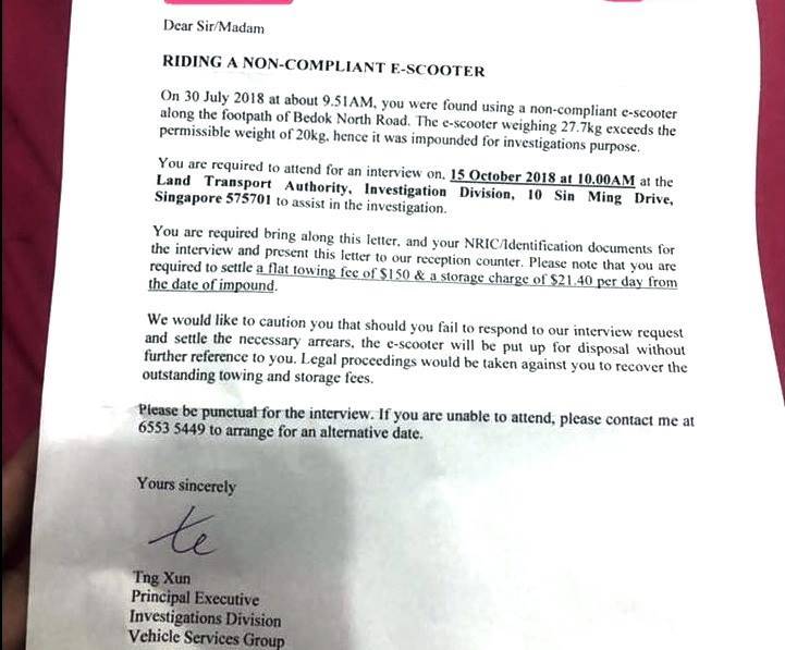广告信件内容还提到,如果这名公众没有到调查部门协助调查和支付这笔数额,当局将在不通知她的情况下,处置她的电动滑板车。