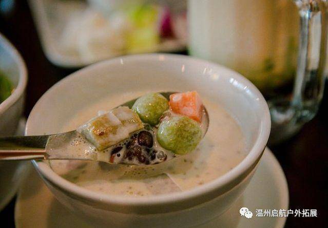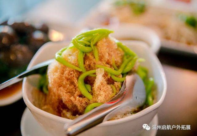 我没搞明白这个像芥末一样的绿条是什么,吃了一口,口感有点像甜的糕点一样,问了下服务员,说是煎蕊。 它本是马国 印度 人的著名甜点,主要成分是冰,然后就是一种由Pandan叶汁(现在多已改为绿豆粉)制成的有浓浓青草味绿色细条,吃时不可缺少的就是淋上特制的椰浆和黑糖。我在 上海 从来没有吃到过,很是喜欢。