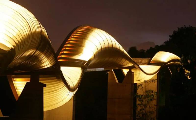 这座总长 274 米的人行桥,桥身名副其实酷似上下起伏的波浪,设计动感十足。这种外形使桥梁上有多处隐秘及贝壳状的休息区。