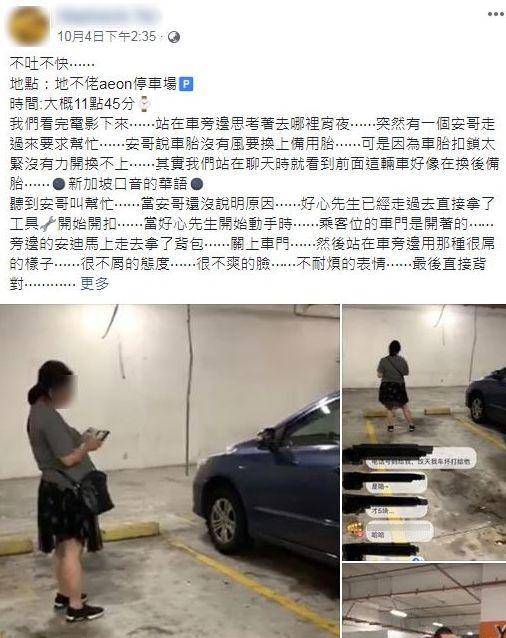她指出,当晚她与男伴看完电影后到泊车场取车,突然一个华裔中年男子走向他们,并指轮胎锁太紧,要求帮忙更换轮胎,其男伴二话不说,便立刻向前拿工具,伸出援手。她说,让他们感觉突兀的是,相信是狮城男子的妻子,立刻到乘客座位抱起手提袋、关上车门,在一旁以不爽、不耐烦和不屑的态度看他们,之后更背对他们。