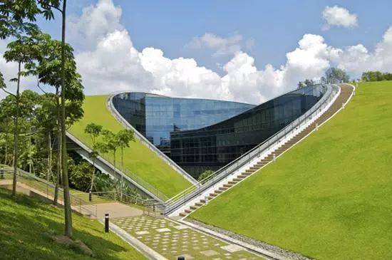 南洋理工大学艺术设计传媒学院(NTU-ADM)坐落在一个树木繁茂如同自然“绿肺”的山谷中。为坚守总规划的初衷,CPG公司在山谷自然区中辟出一块教学地,在建筑造型中景观元素的置入亦发挥了重要作用。NTU-ADM学院楼创建秉承“无建筑(non-building)”的理念,使此地原生态绿植自由地向建筑蔓延伸展。