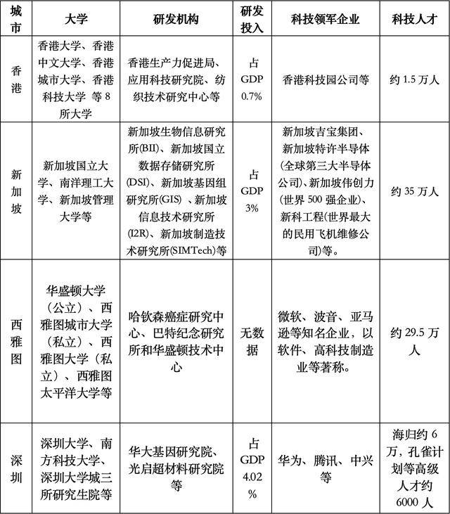 西雅图有华盛顿大学等多个世界著名大学,有华盛顿技术中心等多个高端研究院所,有微软等世界顶级科技公司,科技基础研究、基础应用研究及其产业化能力都很强;深圳有国家级科技企业约5500家,科技应用研究及其产业化能力强。但四个城市在科技研发投入、科技人才数量、科技领军企业等方面还存在较大差异。
