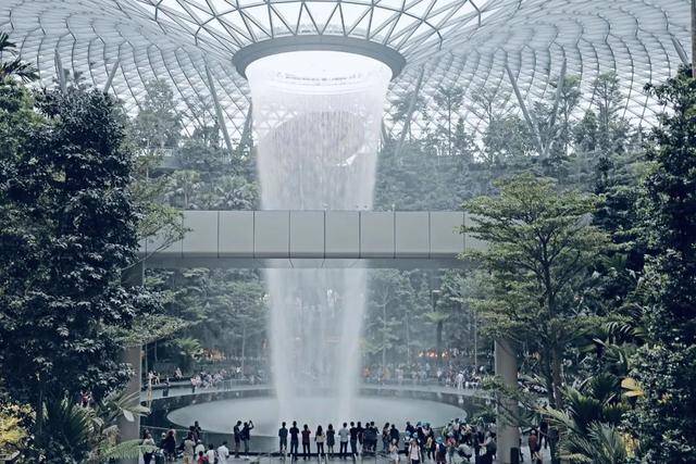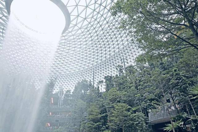 那便是在那里凭空出现了一个巨大的,且极具未来感的瀑布。这个与新加坡樟宜机场航站楼相互连结的购物中心,因其壮观的瀑布占据了许多媒体的头条,不断刷屏,而这个标志性的画面在叔的朋友圈里占领不少位置。