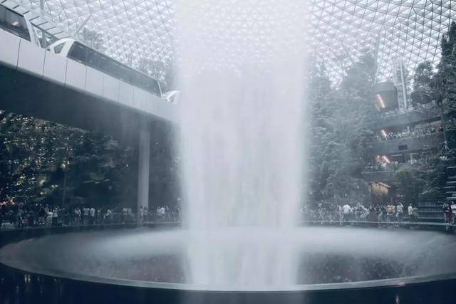 许多人以为瀑布建在机场之内,其实瀑布位于机场三个航站楼中间的位置,由一个旧停车场改造而成,汇集了商铺、餐饮及休闲景观,时不时你还会看到一辆辆机场轻轨从瀑布旁的丛林中穿梭而过,这样奇幻的未来都市感自然引得许多人的围观,人气十足。