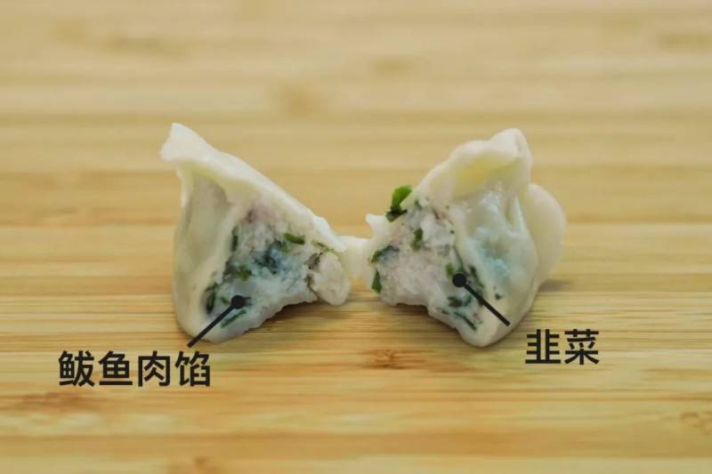 一整个大墨鱼,其实只有40%的桶状鱼身可以做成馅,墨鱼馅细腻绵密,再搭配上韭菜,有种无法言语的搭。