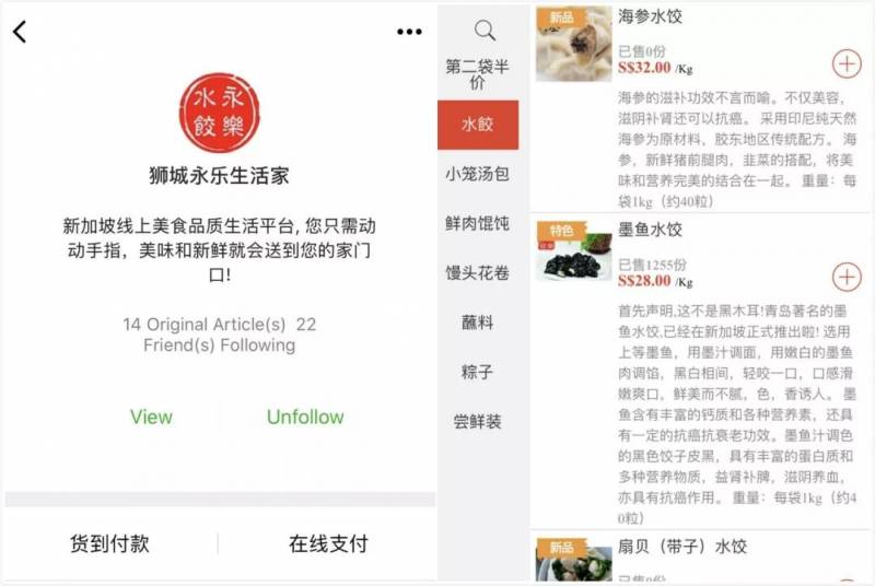 只需关注“狮城永乐生活家”公众号,就能直接在小程序中订购水饺。水饺的价格从S$14/kg – S$32/kg(每公斤约40粒),价格可以说是非常的亲民。