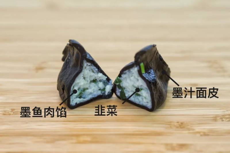 取出墨囊,用墨鱼汁和面制皮,来制作黑色墨鱼水饺,这是比较考功夫的一步,一不小心墨囊就很容易弄破。