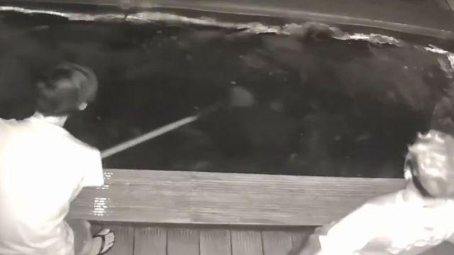 在吃喝之后,这群青年爬进了一个同样上锁的鱼池,池里养著好些鲤鱼。闭路摄像头拍到的视频显示,青年从钓虾场找来了捞网和盛垃圾的畚箕,在鲤鱼池里大捞特捞。据了解,池里当时养有约40条原是用作让顾客喂食的鲤鱼,目前未知是否有鲤鱼被偷走。