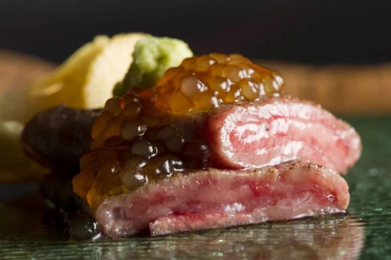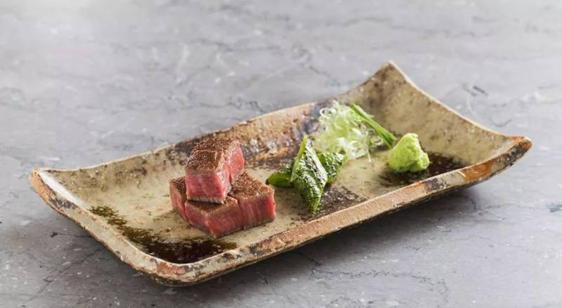 以及滋贺县近江和牛牛扒配芥末与柚子酱