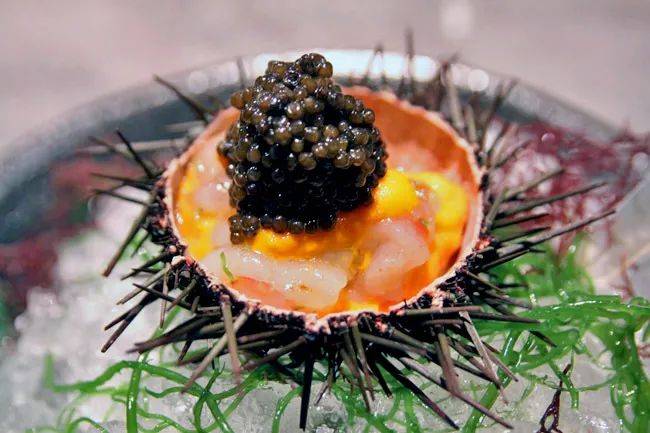 腌渍牡丹虾配海胆和鱼子酱