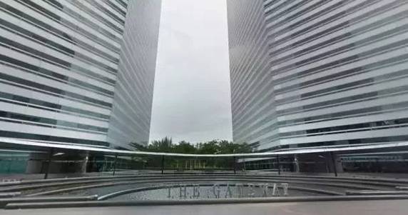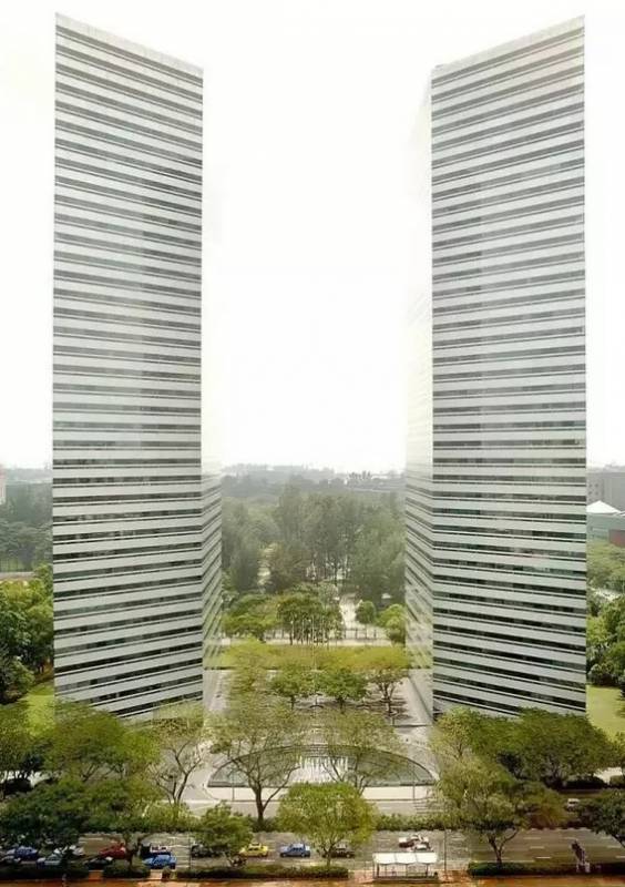 在两座分别呈菱形的大楼之间,有座半圆形的喷水池...