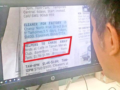 热心公众向本报爆料,称近日在报纸上看见一则招聘广告,称是一家咖啡厅希望聘请帮手,工作是把鸟赶走。