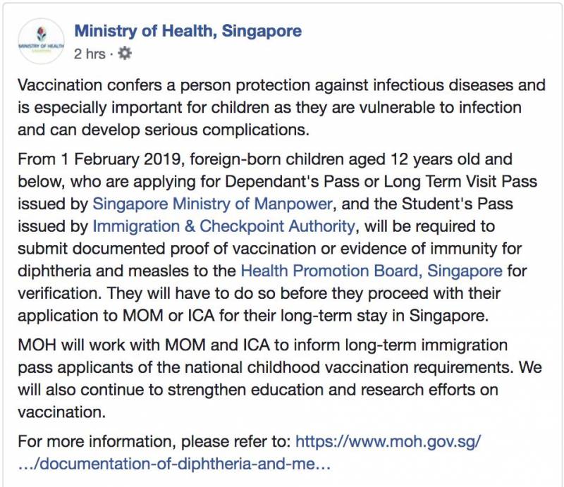 新加坡卫生部(MOH)在今天宣布,从2019年2月1日起,凡是想要为12岁及以下在外国出生的孩童申请新加坡的长期居留准证,必须提交注射过白喉(diphtheria)及麻疹(measles)疫苗的相关证件。
