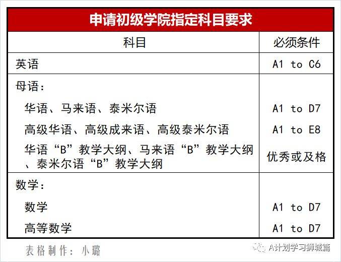 初院录取GCE“O”水准成绩要求: