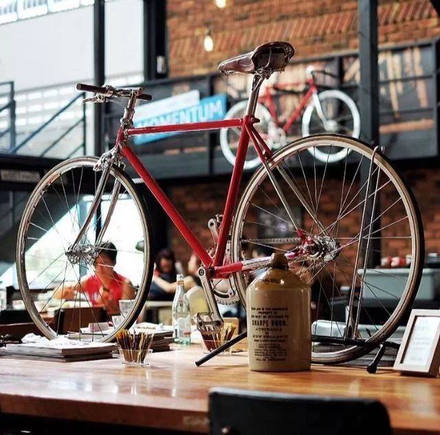 店内的墙上挂了不少自行车的车架,桌子上也摆了不少自行车的装饰品,到处都是自行车的周边。