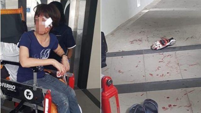 根据网民上传的照片,受害的中年女子坐在轮椅上,脸部有伤,左脸贴上了绷带。地上也可看见明显的血迹。
