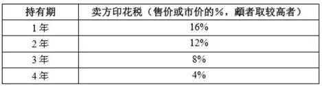 从 2011年 1月 13日,在 2011年 1月 14日或之后购买的住宅产业的持有期将增加到 4年,以新的卖方印花税如下: