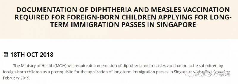 近日,新加坡卫生部发布新规:从明年2月1日起,所有申请在新加坡长期居留的12岁以下外籍儿童,必须先提交白喉(Diphtheria)和麻疹(Measles)疫苗注射证明书。