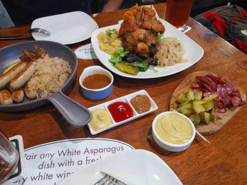 主打香肠和佩奇肘子。那个黄色的酸黄瓜味道的酱汁好好吃,还喝了一杯黑啤。伪装德乙球迷,混迹在真球迷队伍里,大口喝酒,大口吃肉。